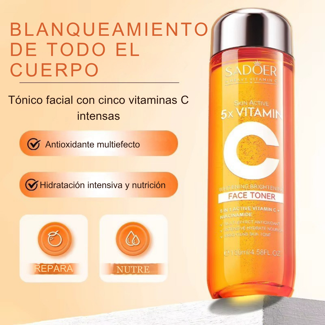 Eleva tu rutina con el Tónico facial blanqueador SADOER 5X con Vitamina C (130 ml). ✨ Aporta luminosidad y ayuda a unificar el tono; 💧 hidrata sin pesadez; 🔄 reequilibra el pH tras la limpieza y prepara la piel para el sérum y la crema; 🛡️ su acción antioxidante contribuye a proteger del estrés oxidativo. Ideal para uso diario, mañana y noche.